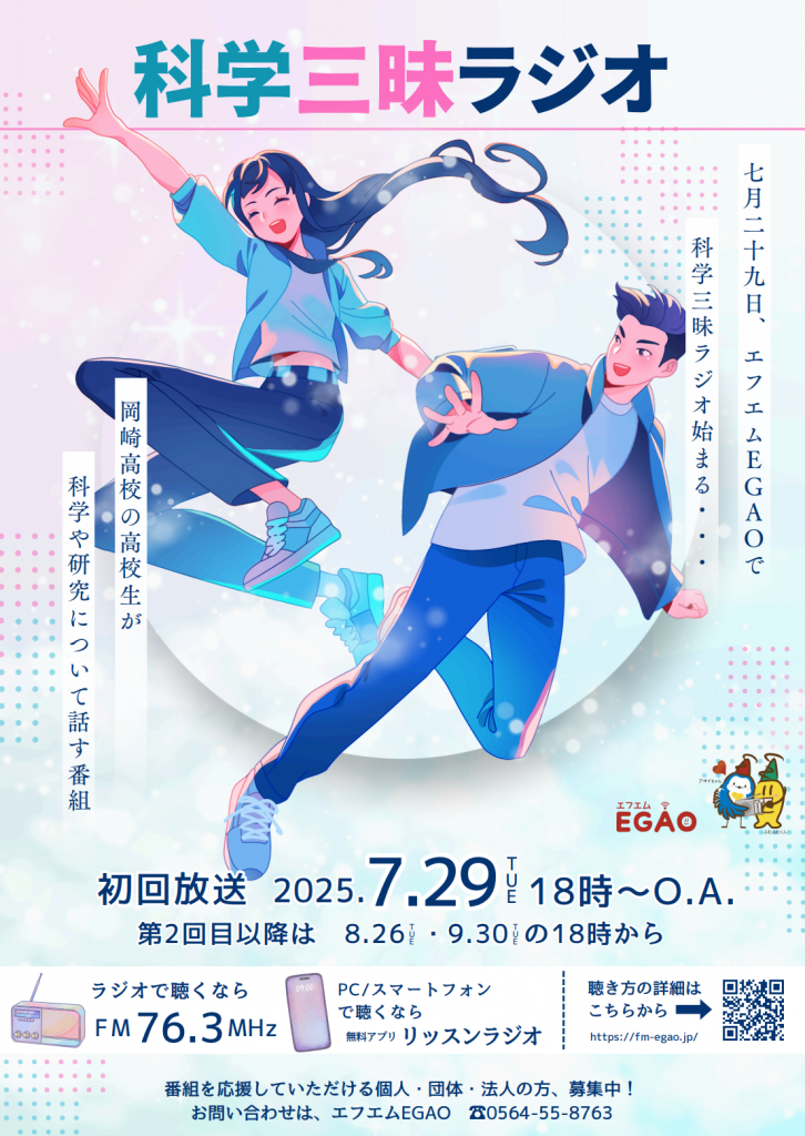 お知らせ 「科学三昧RADIO」放送開始 2025年7月22日 エフエムEGAOにて、岡崎高校の高校生が「科学」や「研究」について話す番組「科学三昧RADIO」の放送がスタートします。初回放送は7/29(火)18:00~です。是非聴いてください(聴取方法はこちら)。なお、放送のアーカイブはエフエムEGAOの公式YouTubeチャンネルや本校HPで公開予定です。